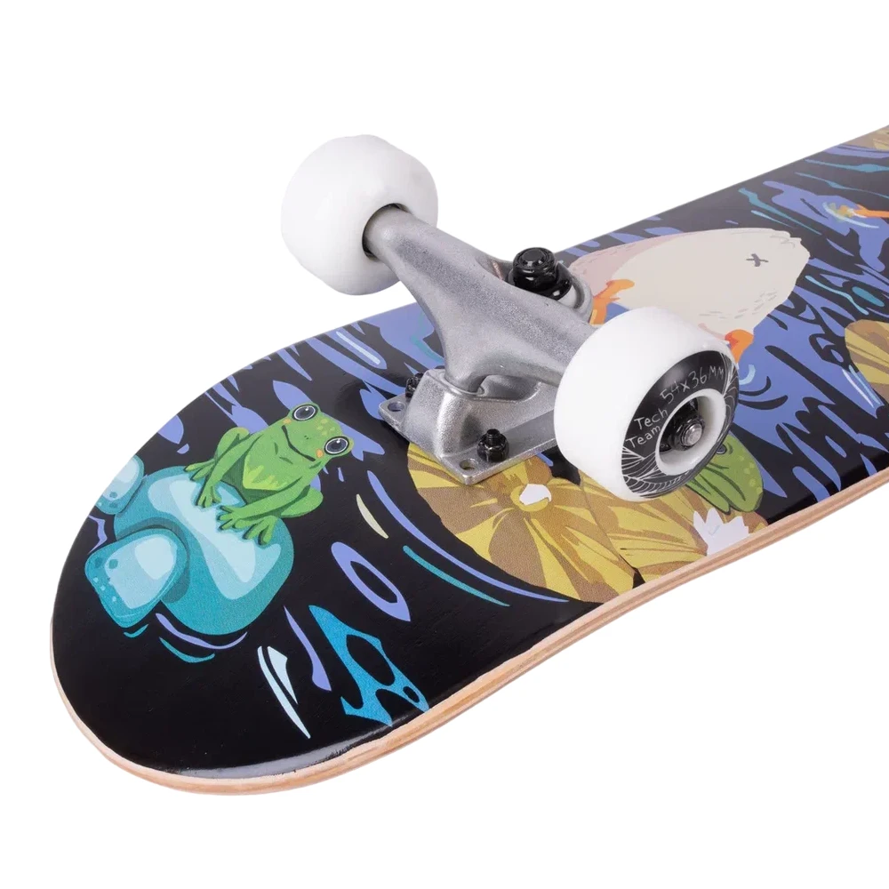 Встречайте скейтборд Tech Team Aliens 2024 голубой - идеальный выбор для тех, кто ищет стиль и функциональность. Скейтборд оснащен колесами из PU размером 54x36 мм с жесткостью 90A и подшипниками ABEC 9 для гладкого и стабильного катания. Дека из семи слоев русского клена размером 29.5”х7,5” обеспечивает превосходную прочность и долговечность. Верхняя часть деки покрыта черной шкуркой с графикой 80AB, а нижняя часть украшена крутым принтом речки, где плавают утки и лягушки. Двойной концевой загиб (Double Kick) делает этот скейтборд идеальным инструментом для выполнения трюков. Tech Team Aliens 2024 голубой - ваш верный спутник в мире скейтбординга!