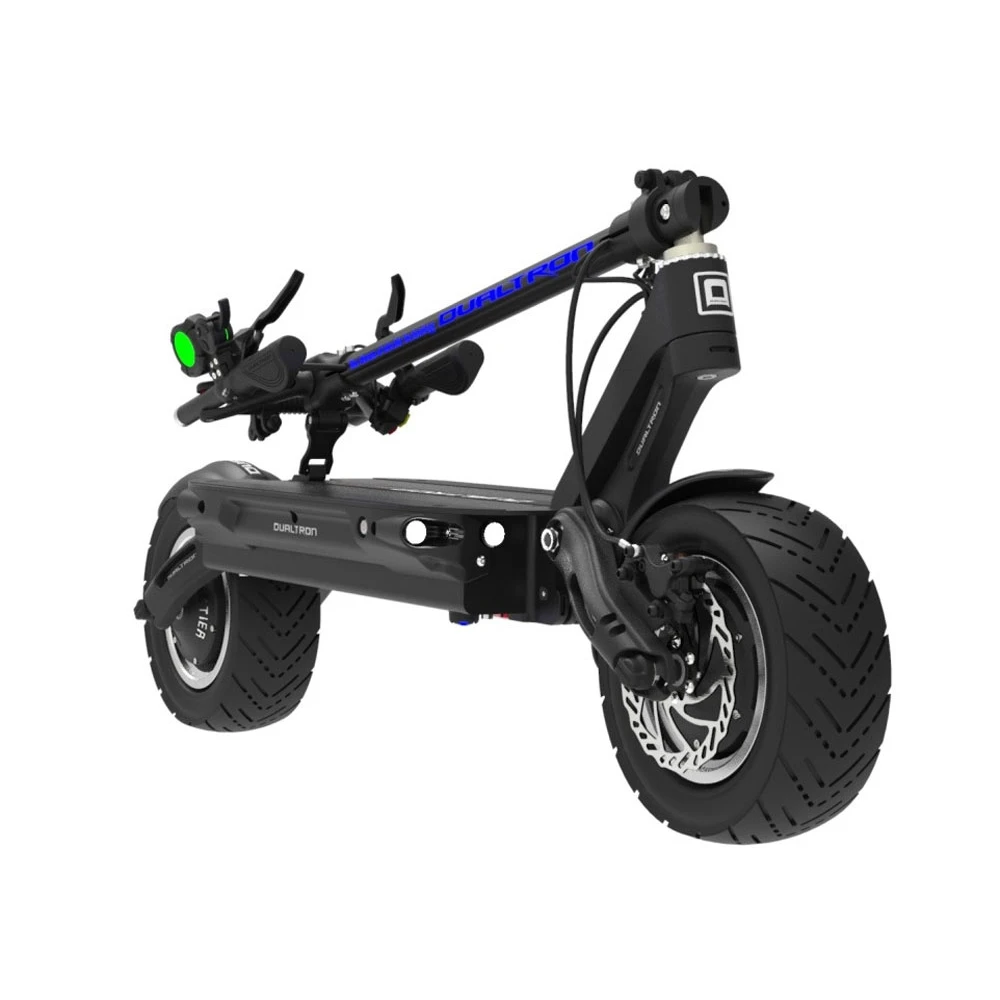 Статный, с добротной конструкцией, два двигателя на каждое колесо, мощность одного 2700 Вт, в сумме 5400 Вт это просто не реально, скорость которую может развить этот агрегат 85 км/ч. Для таких скоростей нужны хорошие тормоза, два гидравлических, ABS система. При торможении происходит дополнительная зарядка аккумулятора. Один мотор можно отключить и наслаждаться спокойной ездой. Для такого самоката нужны хорошие колеса, диаметр равен 11 дюймов.