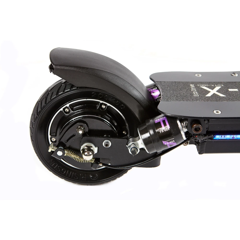 Самокат Eco Drive Mini оснащен колесами 8 дюймов, для контроля над дорожной ситуацией есть барабанные тормоза. Агрегат заводится от ключа, есть внешнее освещение, состоящее из передней фары и светодиодных полосок по боковым сторонам деки. В темное время передвигаться будет безопасно.
