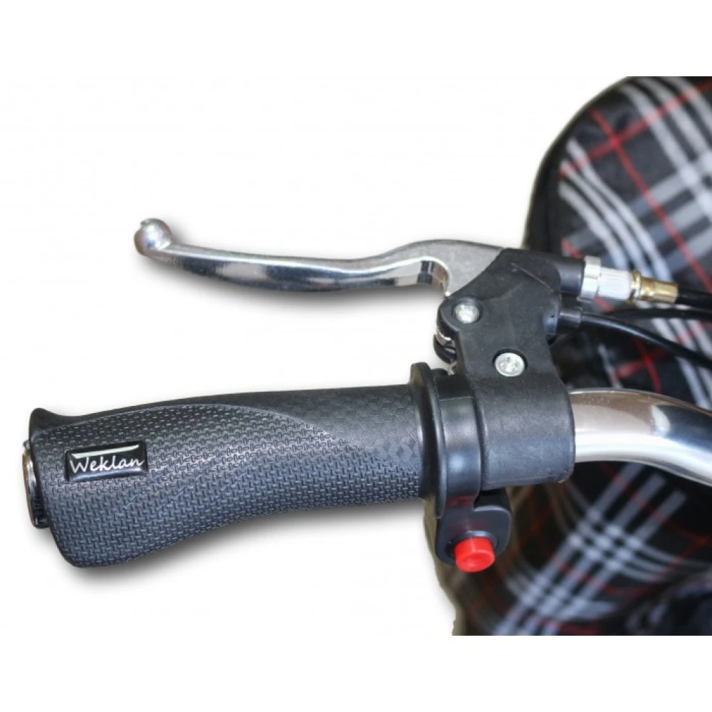 Переднее колесо диаметром 16 дюймов, задние колеса 4 дюйма, есть маленькое четвертое колесо, для плавного заезда на бордюр. Мощность мотор-колеса 500 Вт, максимальная скорость электросамоката 25 км/ч, есть задняя скорость, он очень прост в управлении. Вес 40 кг, максимальная нагрузка 150 кг. Это значительная характеристика модели. Люди со сложностью в передвижение будут более мобильны. А сидение со спинкой добавит комфорта.