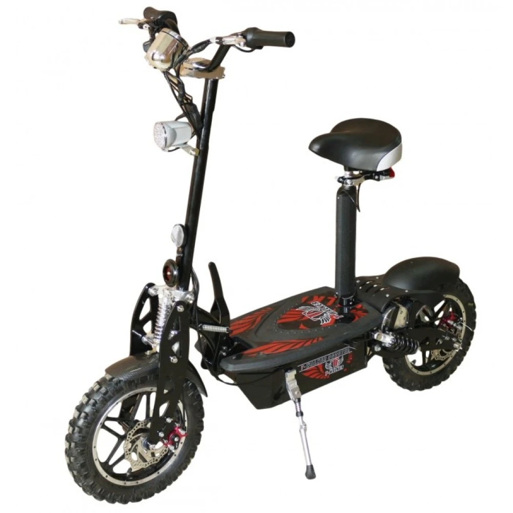 Достаточно мощный двигатель 1000 Вт, позволяет справляться с подъемами и дальними расстояниями. Модель T-Walker 1000 оснащена улучшенными амортизаторами, они сглаживают неровности дорожного покрытия. Массивная платформа, для комфорта на ней крепиться сидение, регулируемое по высоте, его можно убрать в любой момент. В платформе установлен аккумулятор, его емкости хватает на 25 км.