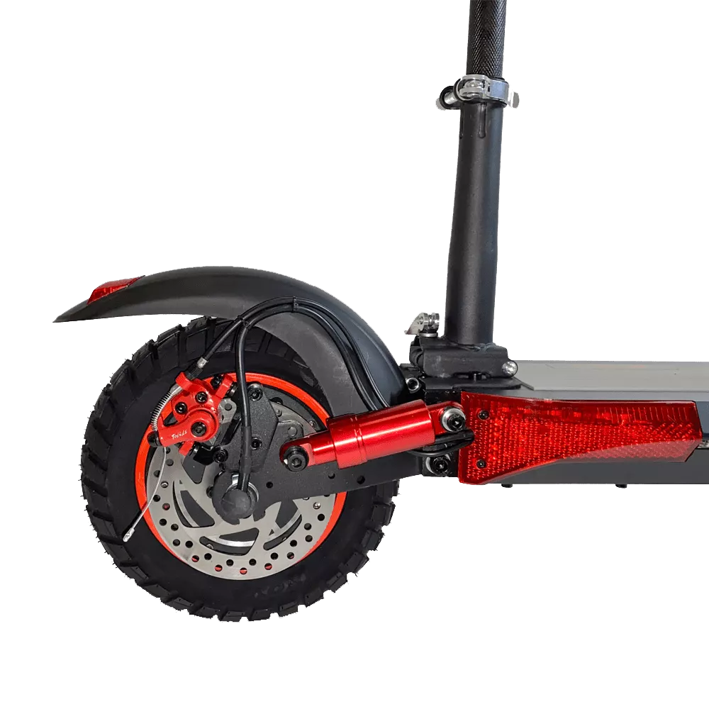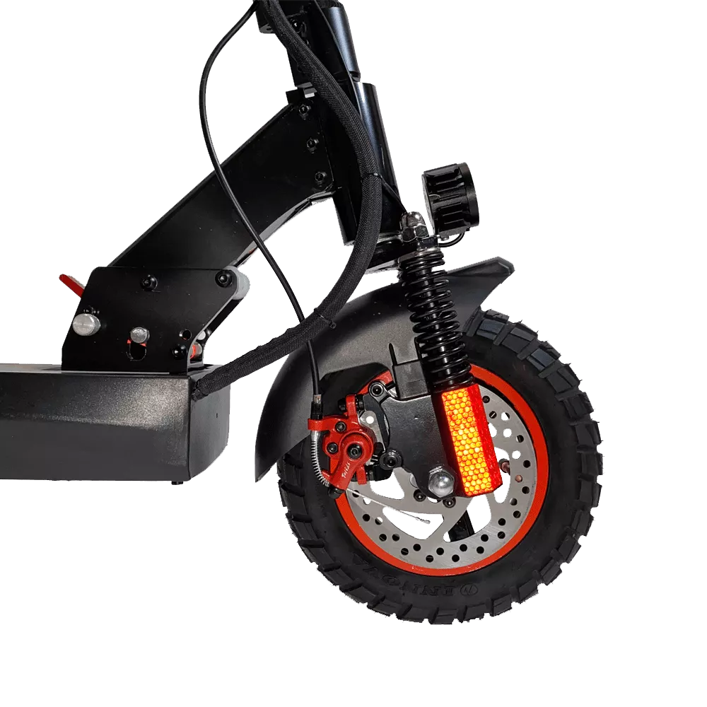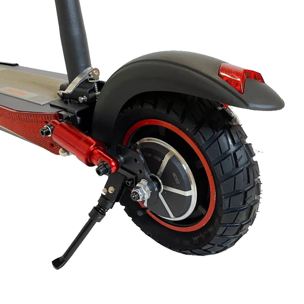 Отличные ходовые характеристики сделали эту модель популярной. Агрегат не боится бездорожья, мощный двигатель 500 Вт и хорошая амортизация делает движение по гравийной и грунтовой дороге достаточно комфортным. Два пружинных амортизатора на переднем и два на заднем колесе делают ход самоката мягким. Для удобного передвижения на большие расстояния предусмотрено съемное сидение. Руль и сидение регулируется по высоте. Колеса с накачиваемыми шинами имеют диаметр 10 дюймов. На переднем и заднем колесах установлена дисковая тормозная система.