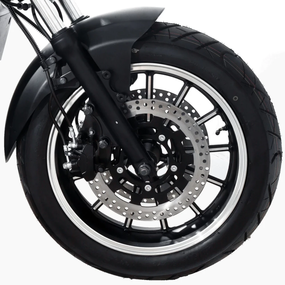 Данный электросутер оснащен широкими колесами и качественной системой амортизации.