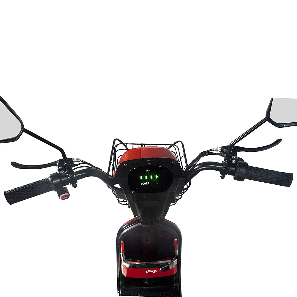 Сидение скутера выполнено из мягкой, прочной и долговечной эко-кожи и имеет прямую спинку для удобной посадки пользователя. На руле установлены анатомические ручки тормоза, кнопки управления светом и переключением скоростей и ручка газа, сделанная из нескользящего материала. В комплекте к скутеру идут зеркала заднего вида, сидение с прямой спинкой для пассажира и корзинка для вещей, выдерживающая до 30 кг.