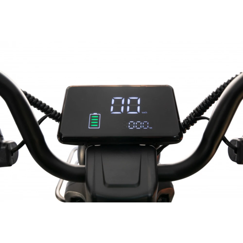 Модель оснащена емким АКБ, одной зарядки которого хватает на 60 км пути. Имеется возможность установки второй АКБ, способной продлить пробен до 100 км.