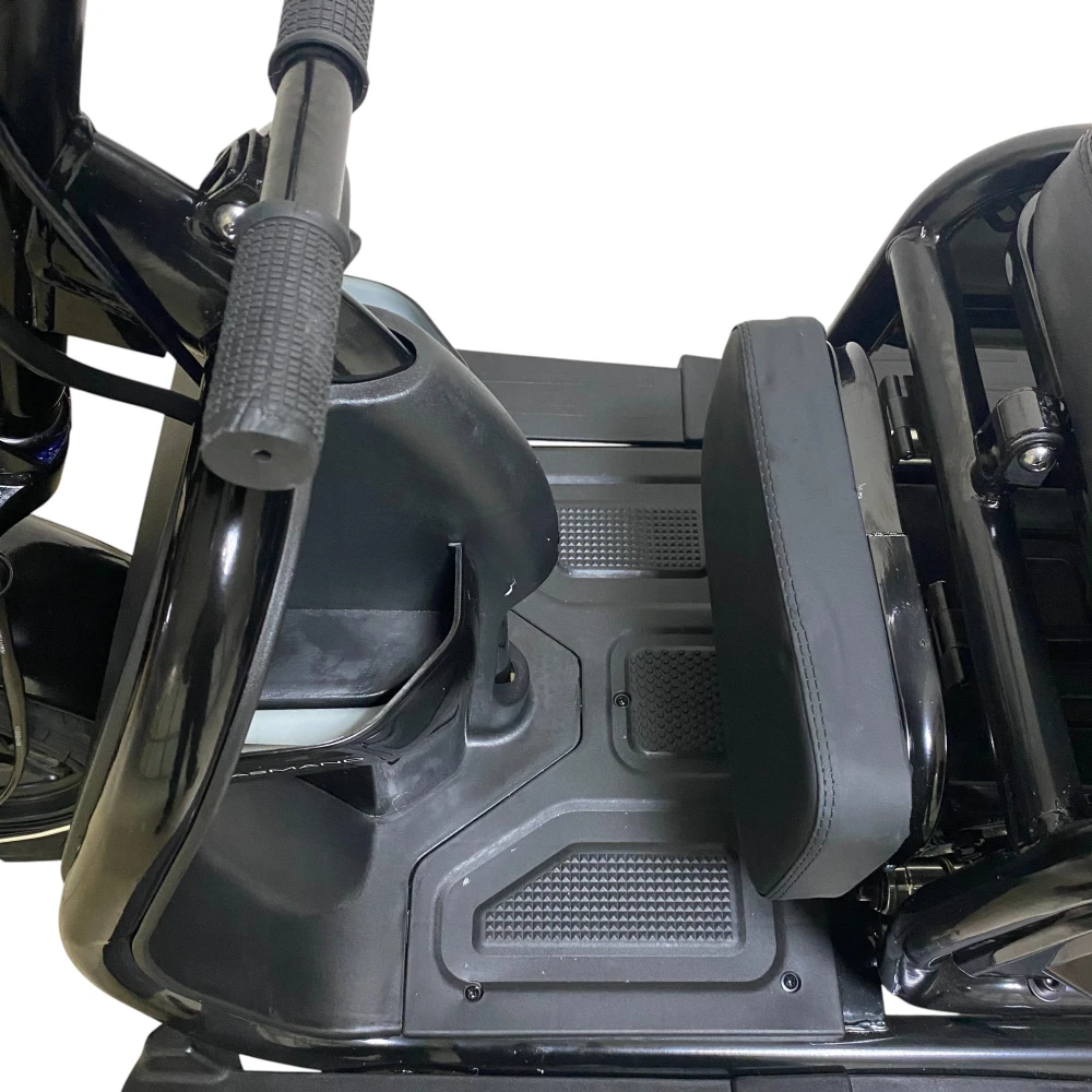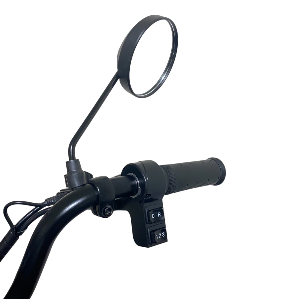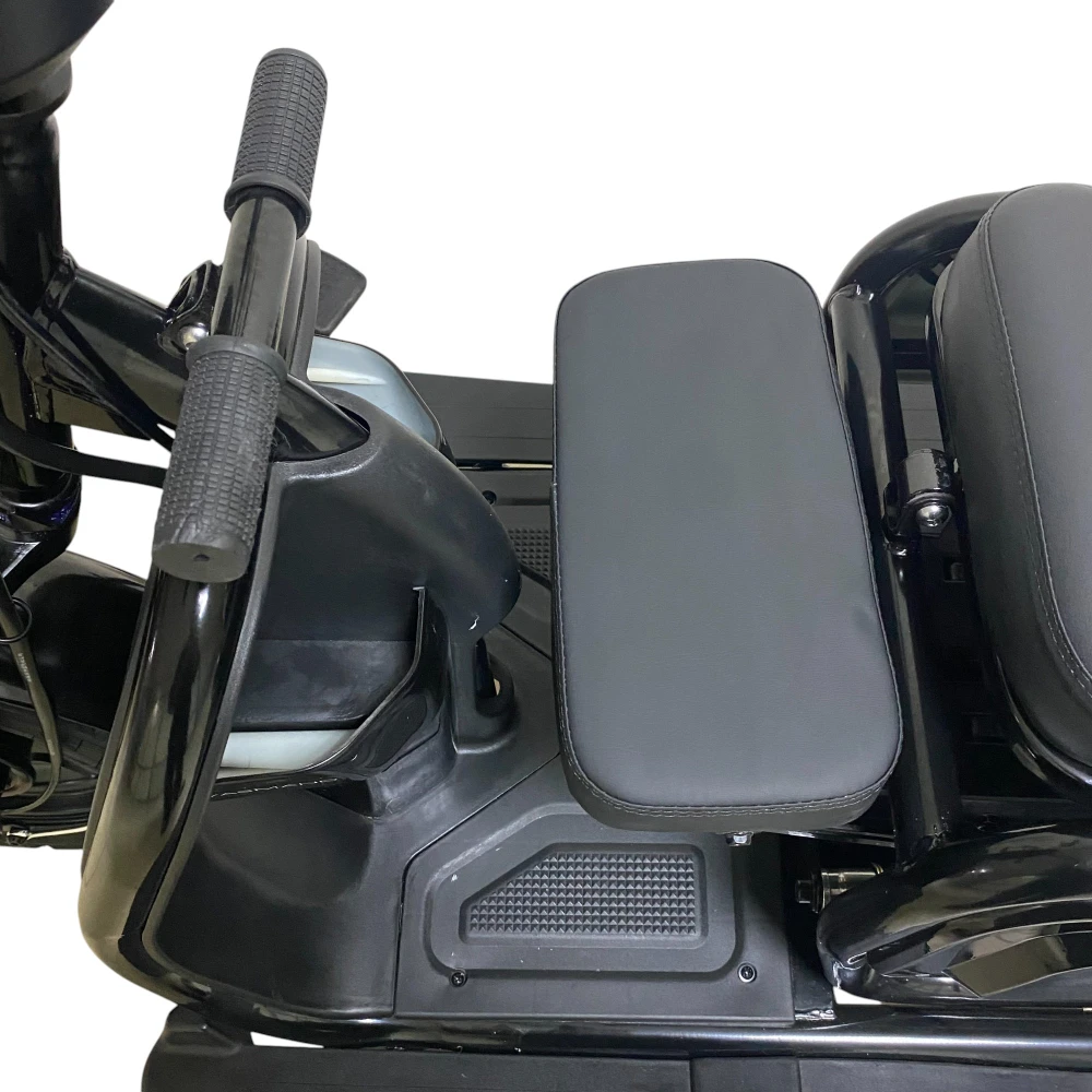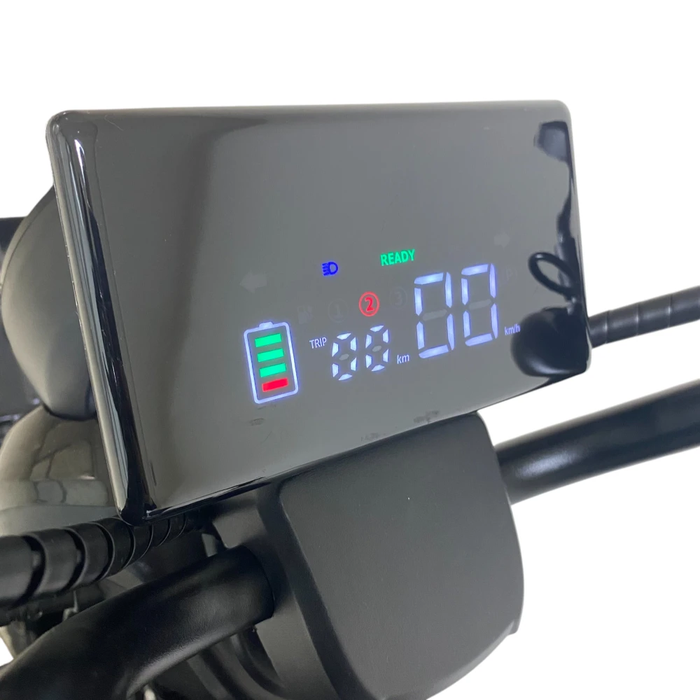 Информативный дисплей показывает скорость, пробег и уровень заряда. Фары, звуковой сигнал и трёхколёсная база делают поездки комфортными и безопасными в городских условиях.