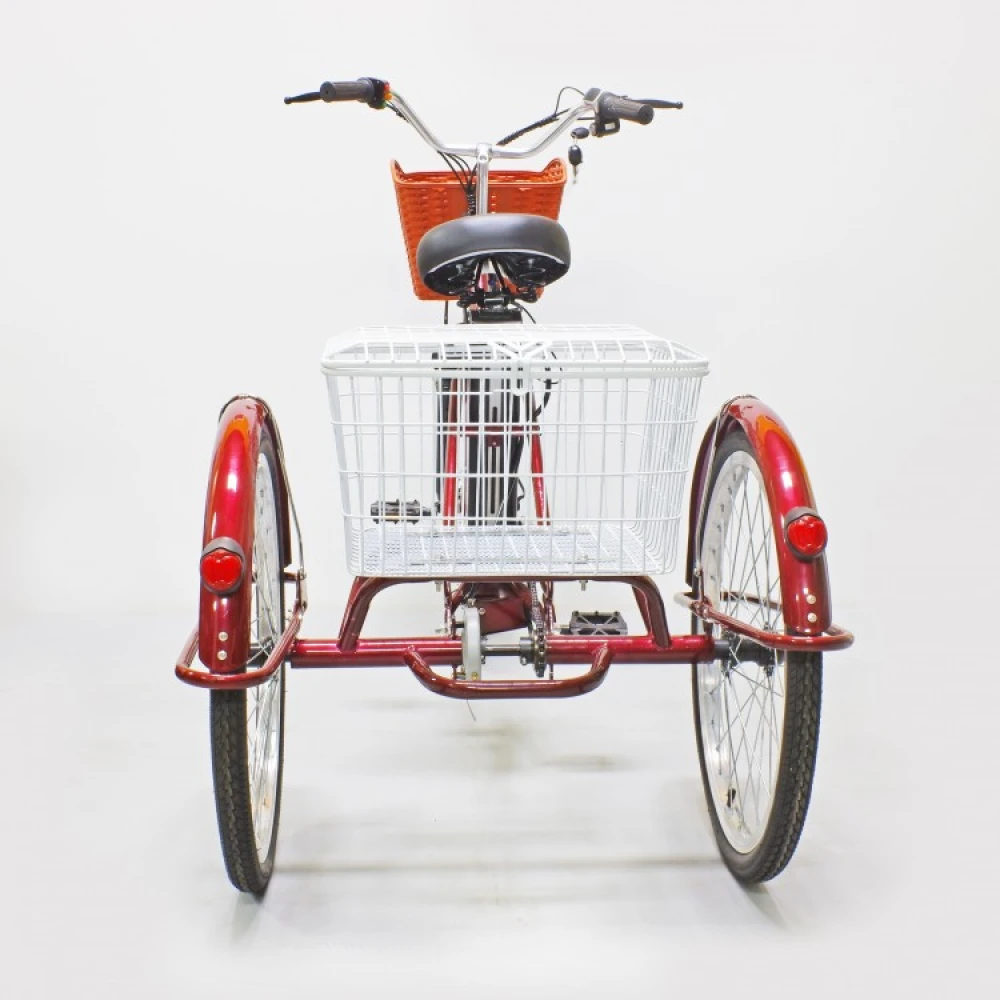 Электровелосипед представлен компактными эргономичными характеристиками, предназначен для ежедневных прогулок и грузоперевозок. Трехколесная модель оснащена всем необходимым для комфорта и удобства. Оснащена 2 компактными корзинами, первая из которых выглядит модно и привлекательно, а вторая – вместительная. Модель оснащена удобным регулируемым сиденьем, повторяющим анатомические части тела ездока, снимающая нагрузку с позвоночника, не допускающая усталости при длительной езде.