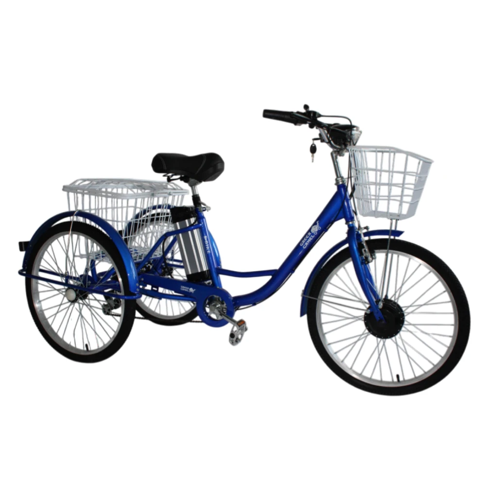 GreenCamel Трайк-24 V3 — трёхколёсный электровелосипед-трицикл для стабильных городских поездок, доставки или отдыха. Низкий центр тяжести обеспечивает устойчивость, максимальная скорость 25 км/ч, нагрузка 150 кг, пробег до 40 км. Идеален для тех, кто ценит безопасность и простоту.