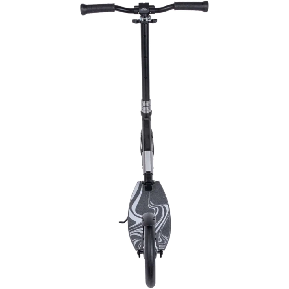 Самокат оснащен широкой нескользящей декой, параметры ширины и длины которой составляют 150 мм и 580 мм. Поверхностная часть оформлена брендовым рисунком, выглядит круто и дорого.