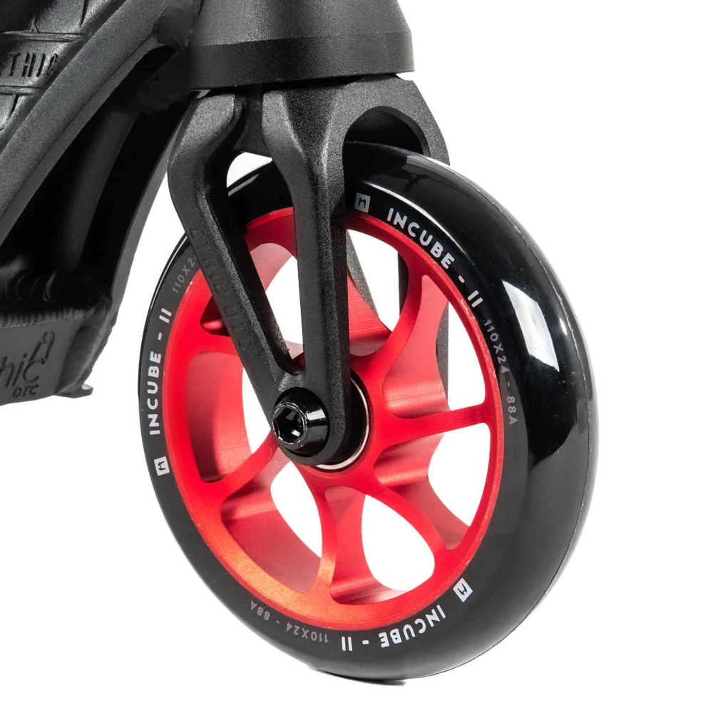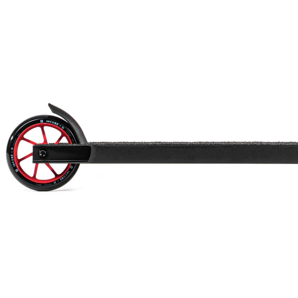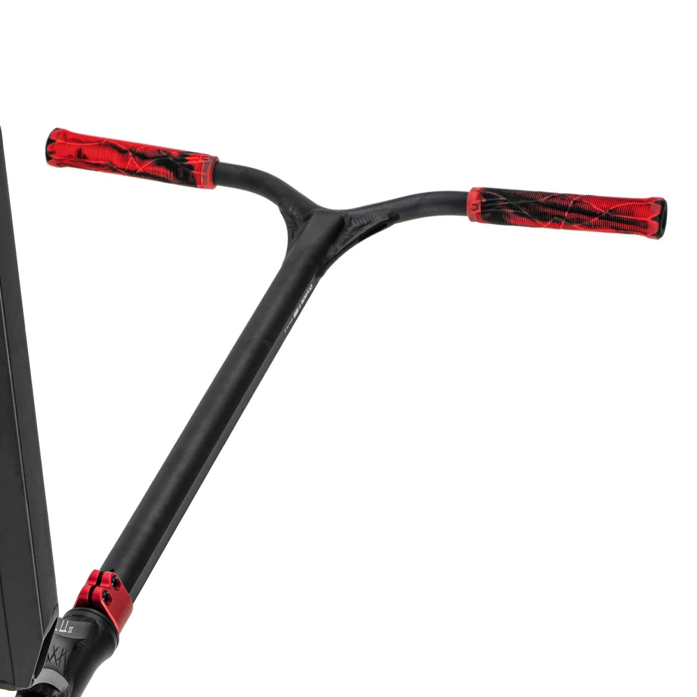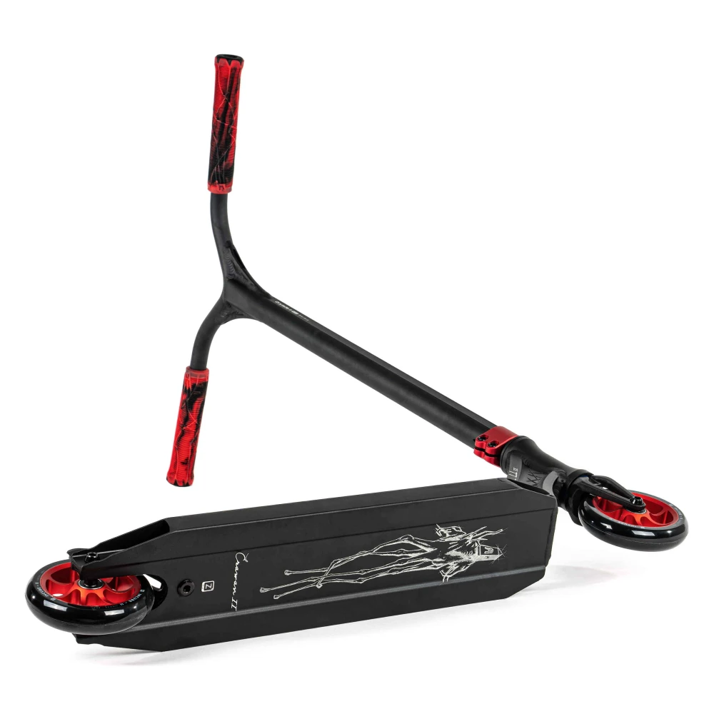 Этот самокат — идеальный выбор для тех, кто предпочитает яркость и динамику в каждой детали. Вопреки строгим черным тонам, элементы самоката, такие как грипсы, диски и хомут, окрашены в насыщенный красный цвет, что придает ему дерзкий и запоминающийся вид. С весом всего 2.79 кг, он обеспечивает легкость и маневренность, что делает его идеальным для выполнения сложных трюков. Диаметр колес 110 мм и подшипники класса ABEC 9 гарантируют плавность и скорость, позволяя вам наслаждаться каждой поездкой.