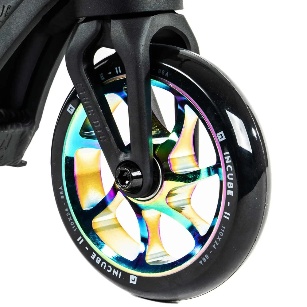 Ethic Erawan V2 (S) neochrome — это не просто трюковой самокат, а настоящее произведение искусства в мире экстрима. Сочетание строгих черных тонов с яркими дисками и хомутом в градиентном цветовом исполнении с эффектом бензина создает уникальный стиль, который привлекает внимание и подчеркивает индивидуальность райдера. Этот самокат весит всего 2.79 кг, что делает его невероятно легким и удобным для выполнения трюков любой сложности.Колеса диаметром 110 мм и высококачественные подшипники класса ABEC 9 обеспечивают плавность и стабильность движения, позволяя райдеру полностью сосредоточиться на выполнении трюков.