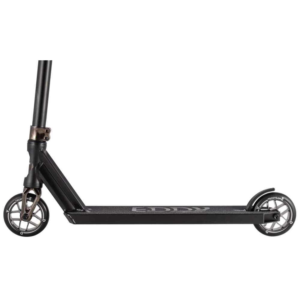Новейшая алюминиевая вилка IHC-компрессии оснащена зажимом из двух болтов соединяющих с рулем из закалённой "хромолевой" стали в диаметре 31,8 мм в классической форме «крылья чайки». Диск у колеса из алюминия средней жесткости 88 A, диаметр 110 мм и ширина 24 мм выполнены из высочайшего по качеству полиуретана с технологией "Super High Rebound". Благодаря технологии отскок резкий и высокий. Модель выпускается в черном окрасе есть с вариацией зажима вместе с вилкой «нео-хром» на анти скользящем покрытии есть фирменный дизайнерский элемент отображающий название модели, так-же на абортной стороне деки есть надпись. Eddy очень стильный и качественно выполненный помошник, инженерные решения очень прогрессивны и смелы. Данная модель преставлена в полностью черном исполнении.