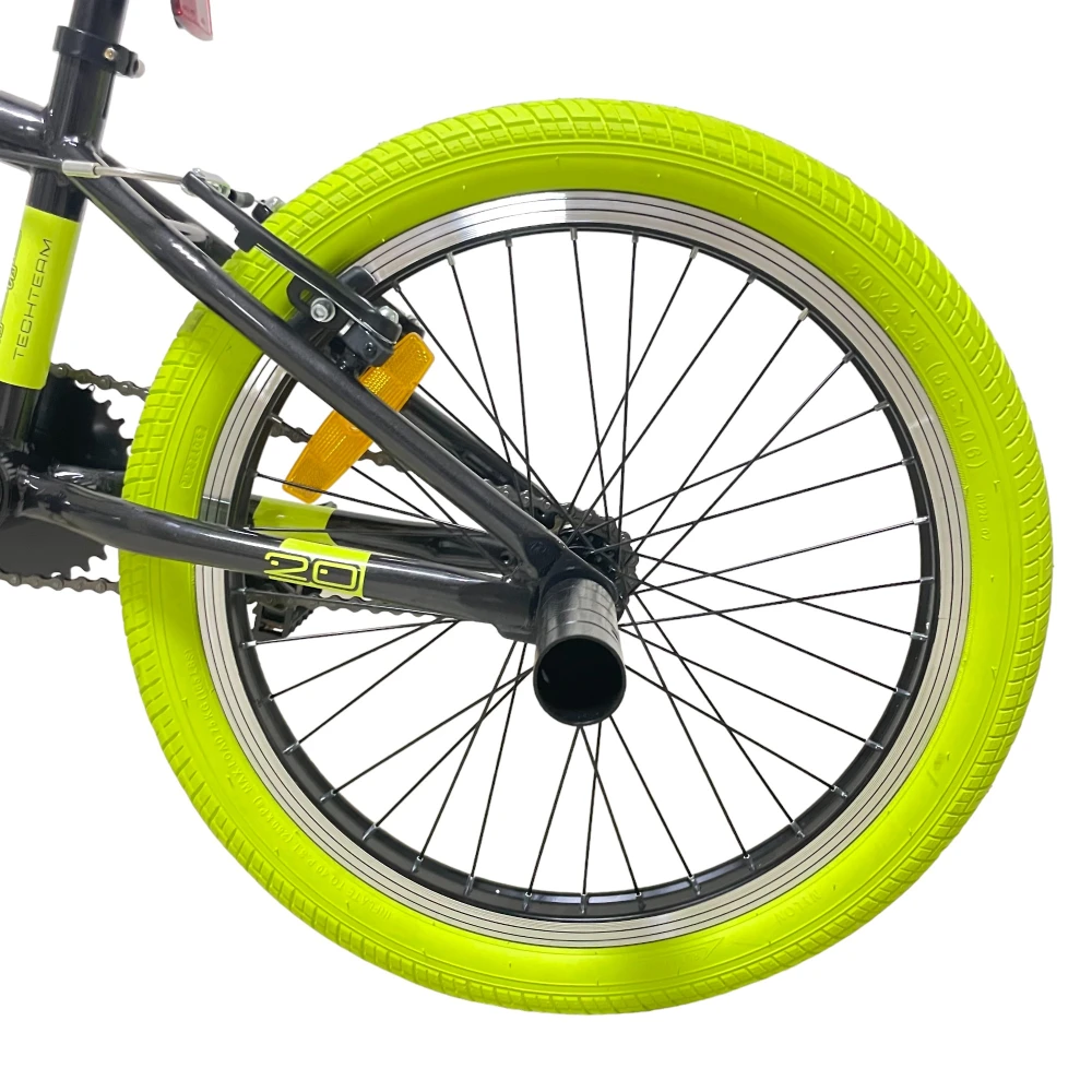Велосипед BMX Tech Team GOOF 2024 в черном цвете с зеленоватыми рулем и покрышками – это сочетание стиля и надежности. С максимальной нагрузкой до 110 кг и 20-дюймовыми колесами, этот велосипед легко справится с любыми испытаниями. Ободные тормоза V-типа из алюминия спереди и сзади обеспечат безопасность и контроль. Стальная вилка и рама размером 18,7 дюйма делают этот велосипед прочным и готовым к любым трюкам. Пеги на передних и задних колесах и трещотка на 16 зубьев добавляют функциональности и делают его идеальным для экстремальных видов спорта.